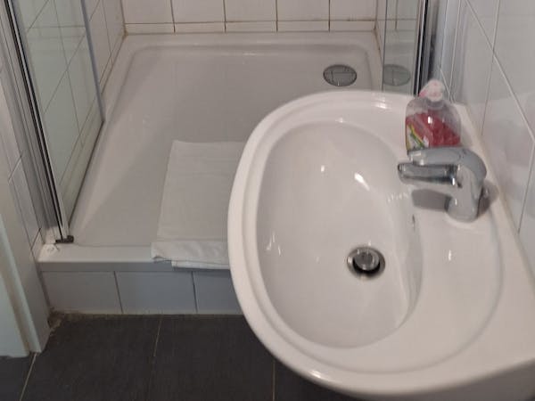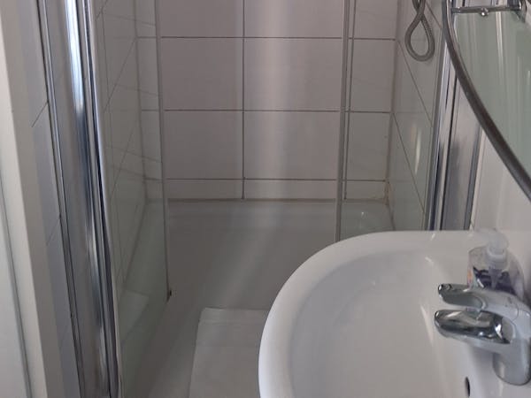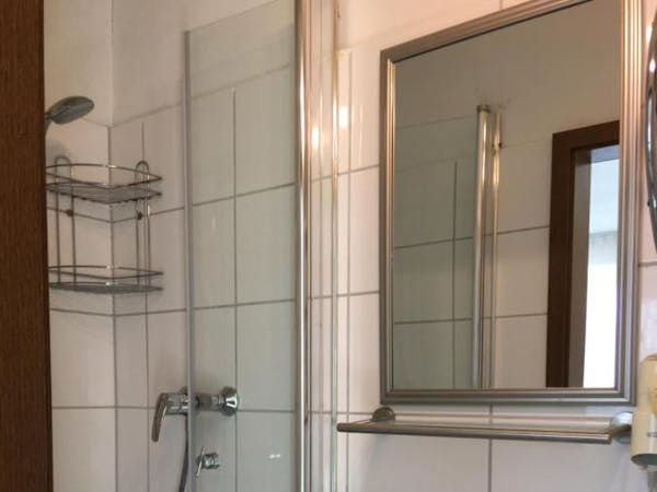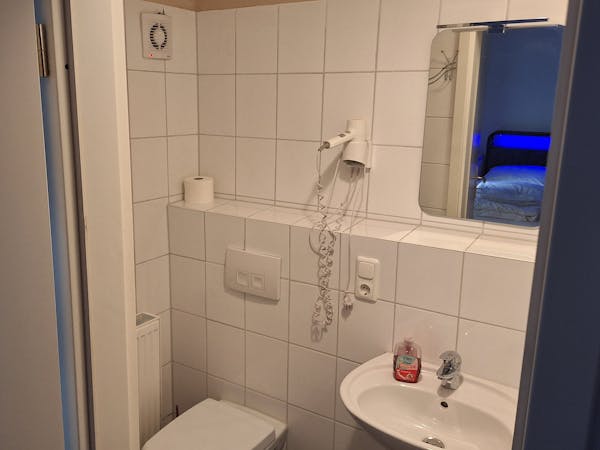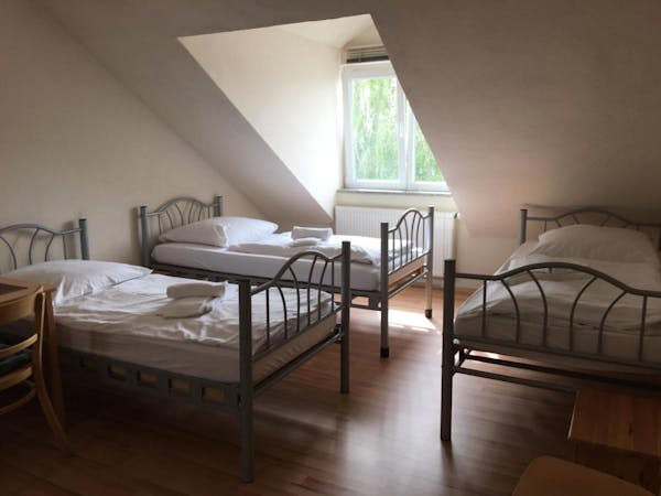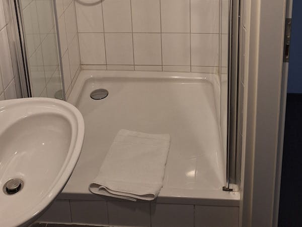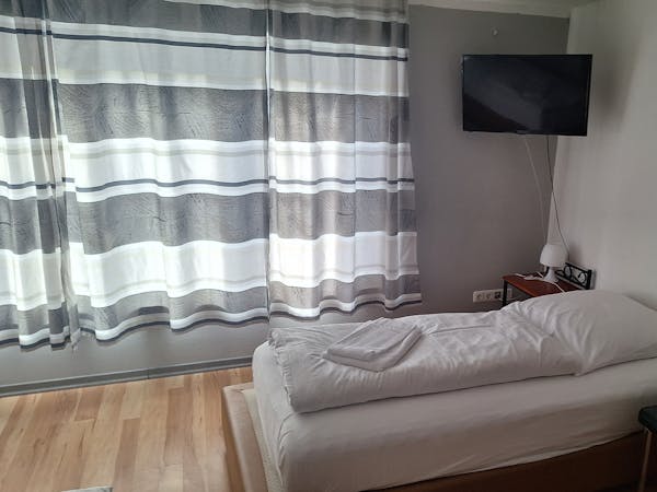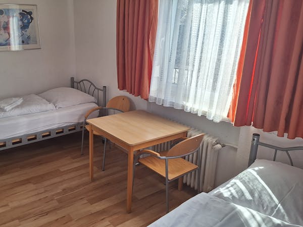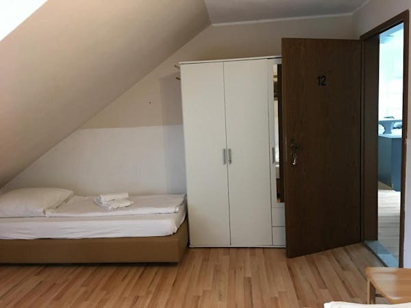The triple room is equipped with three single beds, a small table and satellite TV. A private shower with toilet ensures hygiene. Blinds also offer good sleeping comfort and allow you to darken the room as desired. Ideal for a relaxing stay!