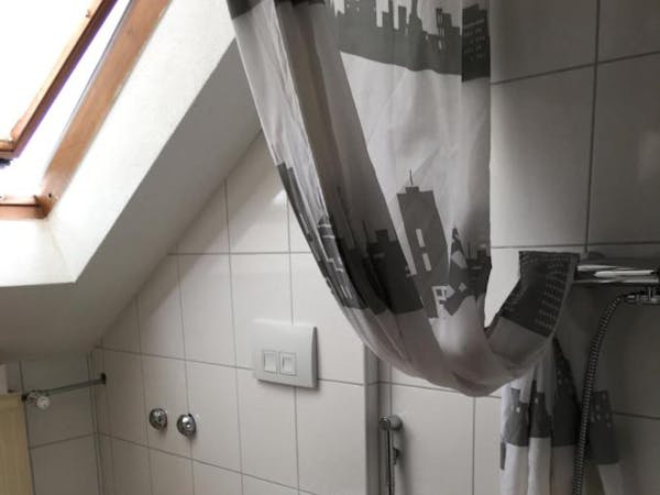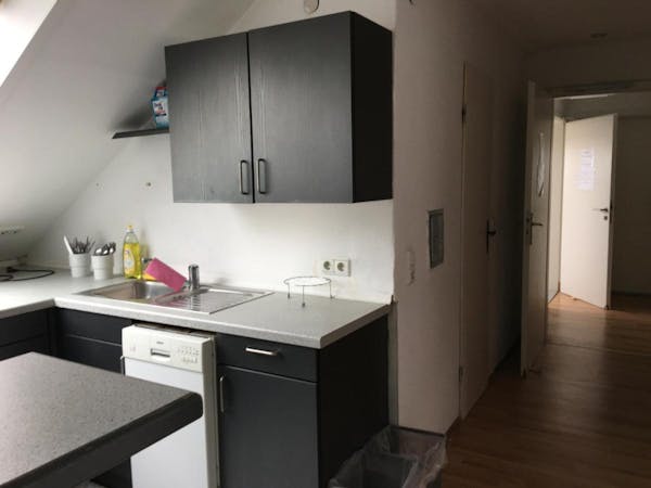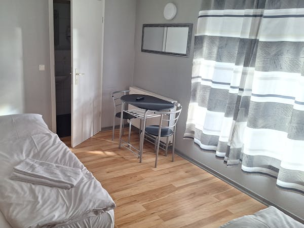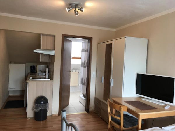 This cozy attic apartment can accommodate up to three people. It has a well-equipped kitchen, a wardrobe, a communal dining area and satellite TV. A private shower and toilet complete the offer and provide additional comfort. Ideal for a relaxing stay!