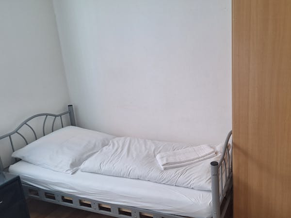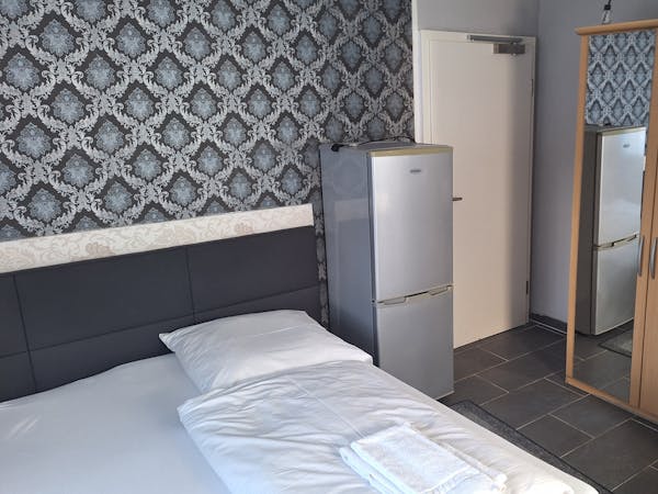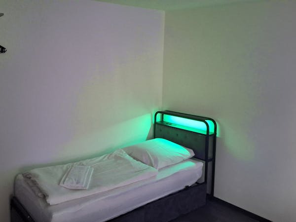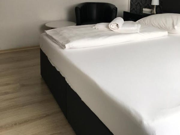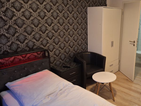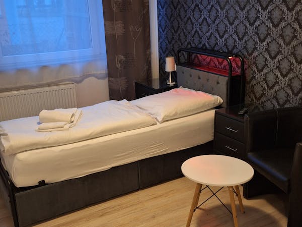 The single room is modernly furnished and offers a comfortable bed with integrated sockets and an LED night light. There is also a wardrobe, satellite TV and an armchair with a small table. A private shower, toilet and blinds round off the offer perfectly.