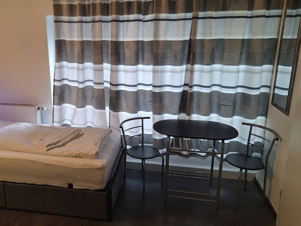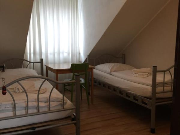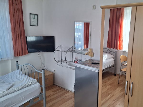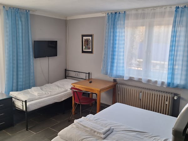 The twin room has two separate beds, a wardrobe, a dining table with chairs and satellite TV. A sink is also available. The blinds ensure privacy. The shared bathroom in the hallway is shared with two rooms, which is ideal for travelers.