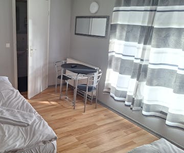 The triple room is equipped with three single beds, a small table and satellite TV. A private shower with toilet ensures hygiene. Blinds also offer good sleeping comfort and allow you to darken the room as desired. Ideal for a relaxing stay!